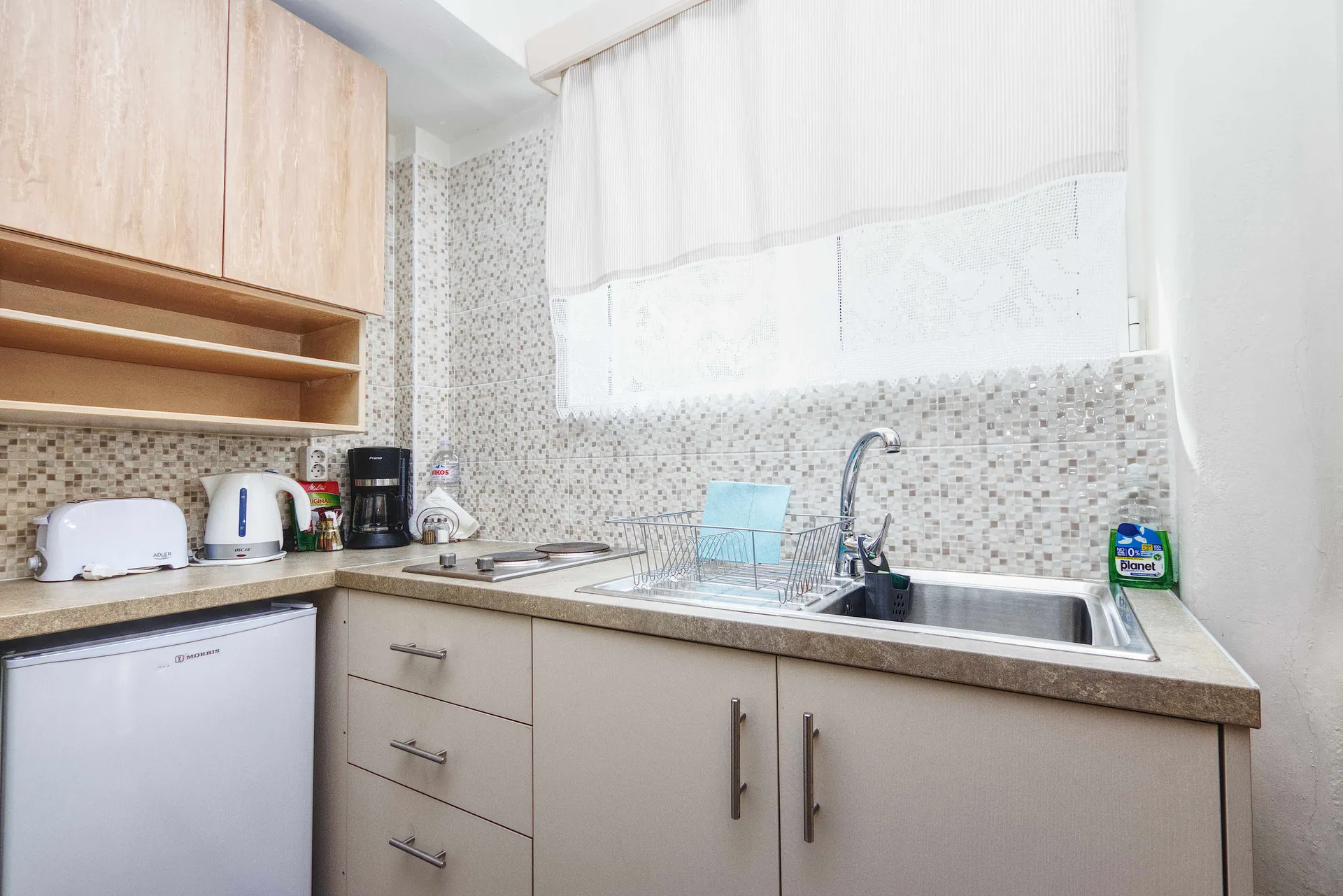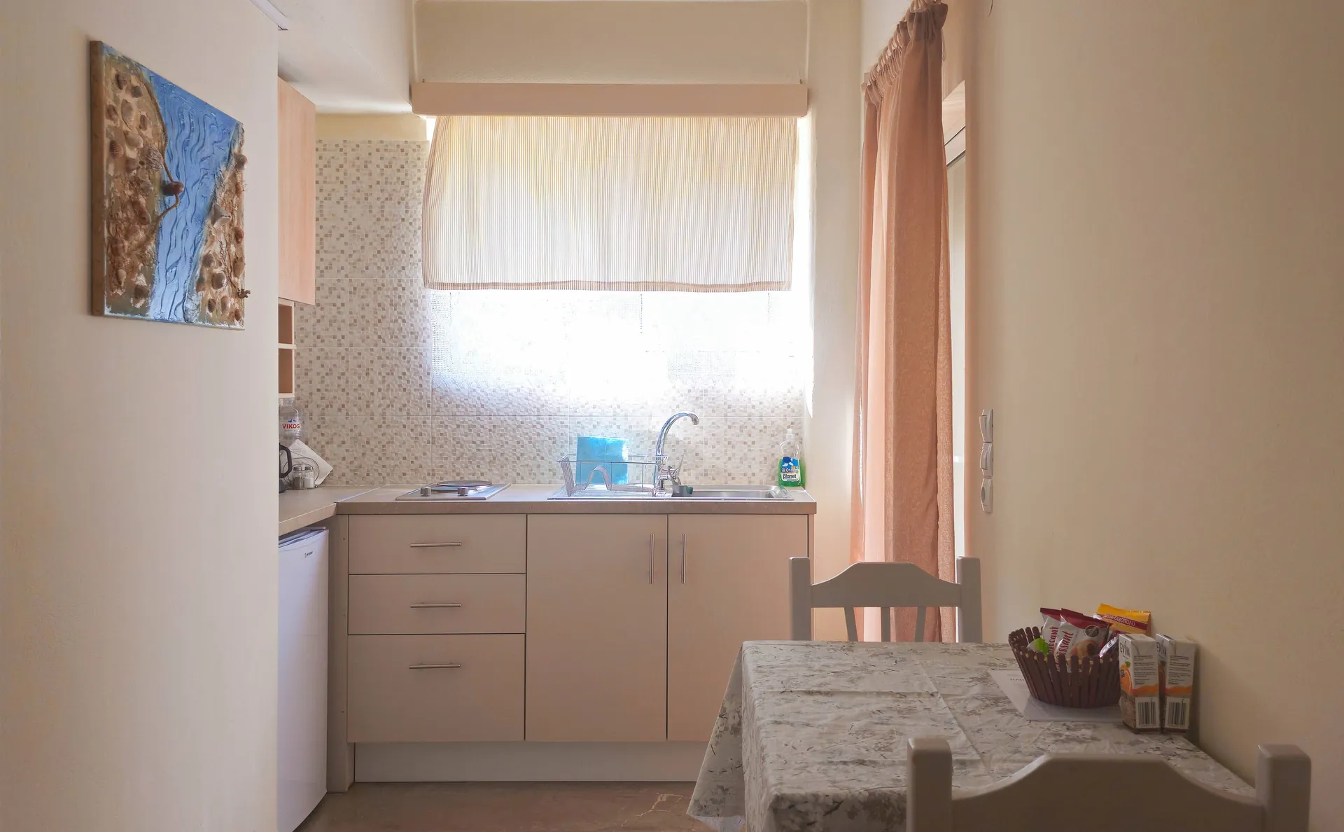 Comfortable apartment with two private balconies, one with sea view and the other facing the mountain for quieter moments of relaxation. Ideal for couples or small families who want to enjoy different views of nature from their room. Standard Apartment 1 is located on the second floor and has two private balconies with double view – to the sea of Tolo and the island of Romvi on one side, and to the green mountain on the other. Ideal for two persons, it offers an equipped kitchen and comfortable spaces.